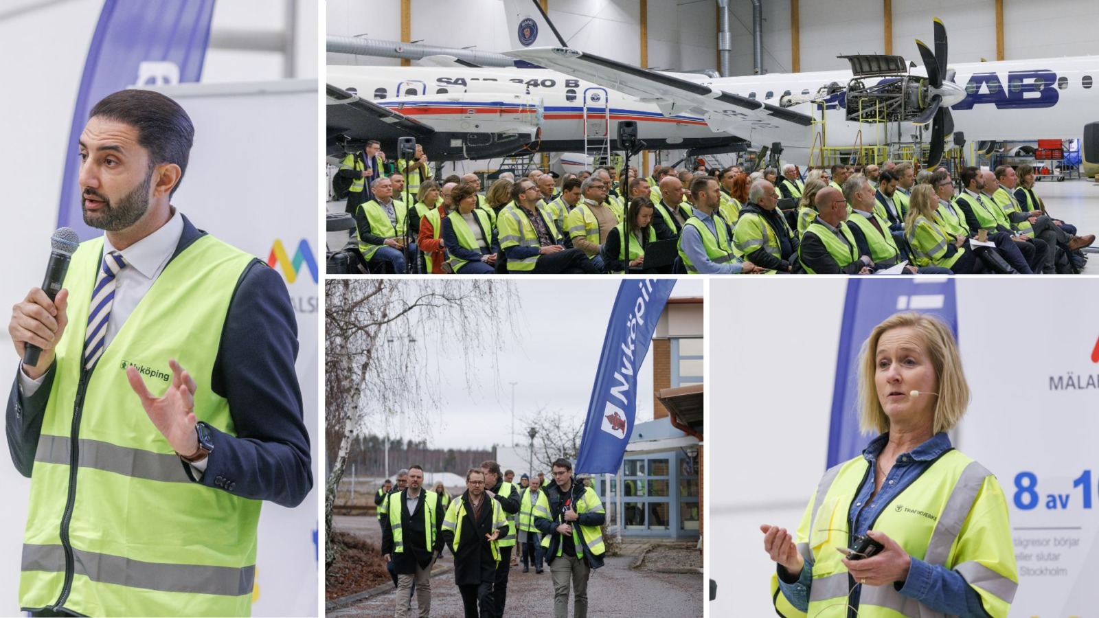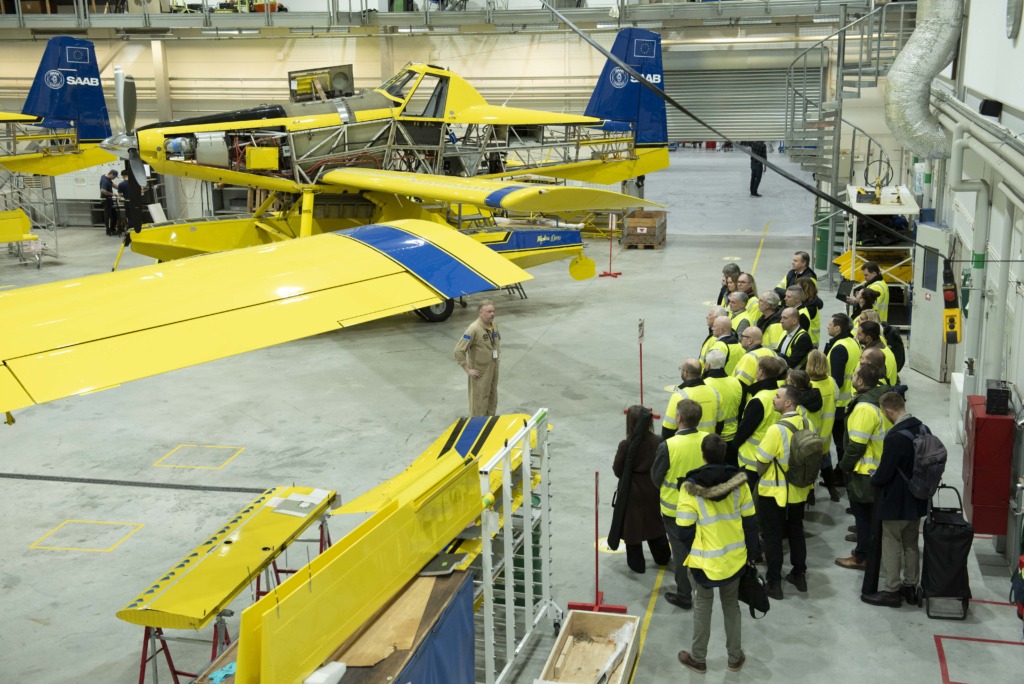 Som avslutning på temadagen hölls ett studiebesök på SAABs flygplansunderhållsverkstad för bland annat MSB-brandflyg. Industri- och försvarskoncernen SAAB har etablerat sig som en betydande arbetsgivare på Skavsta. Hans Wibom, Site Manager på SAAB Skavsta, beskrev företagets snabbt växande behov av teknisk kompetens, särskilt inom flygteknik.