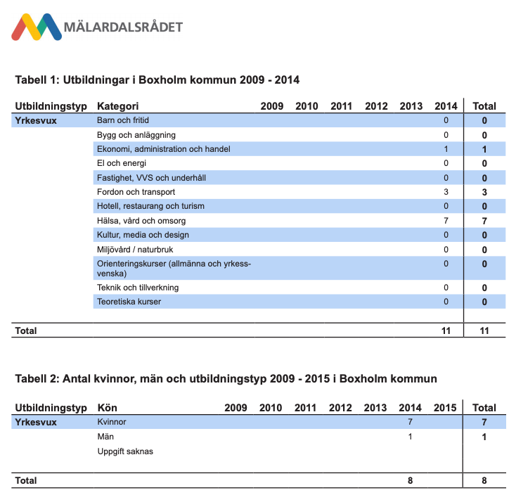 Kartläggning av kommunala yrkesutbildningar: Östergötlands län – Kommuner i Östergötlands län– Excel pivottabell Östergötland