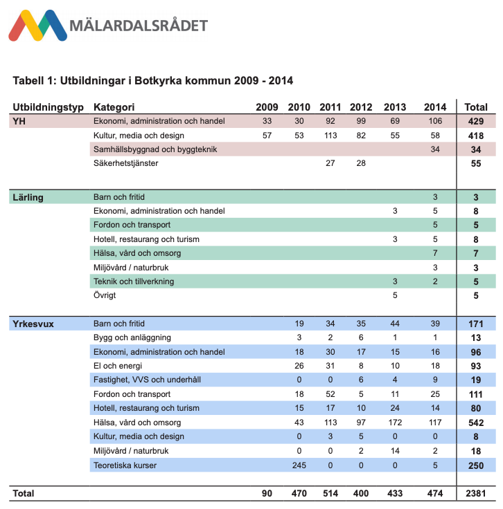 Kartläggning av kommunala yrkesutbildningar: Stockholms län – Kommuner i Stockholms län– Excel pivottabell Stockholm
