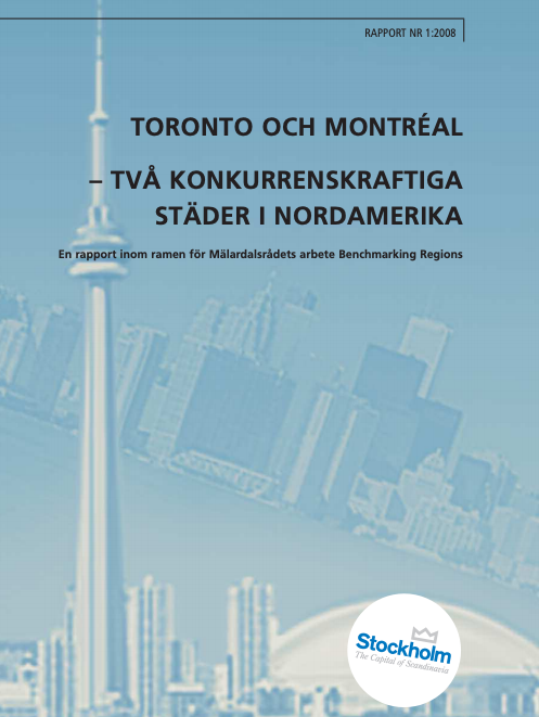 Mycket förenar Toronto, Montréal och Stockholm-Mälarregionen – bl.a. hög internationell attraktionskraft, närhet till stor internationell marknad, väl fungerande institutioner, högteknologi och hög forskningsintensitet, kreativitet och innovationer. Men också lokaliseringen vid vattnet, skalan med inte allt för stora städer med väl utvecklade kommunikationer, kulturell mångfald, god livskvalitet och naturskön miljö. Med dessa likheter i minnet, är det intressant att dra paralleller, att jämföra och lära och att spegla Stockholm-Mälarregionen i dessa båda kanadensiska storstadsregioner. Rapporten har tagits fram av Suzanne Dufresne, tidigare verksam vid Regionplaneoch trafikkontoret i Stockholm och numera bosatt i Kanada.