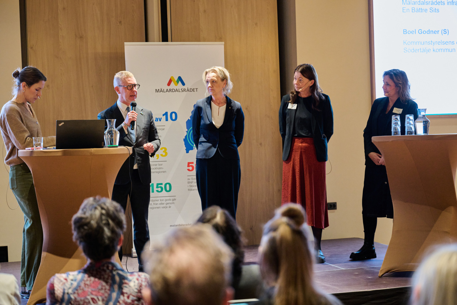 Kristoffer Tamsons (M), ordförande Godstransportrådet, inleder Godsdagen 2025. På scenen även Boel Godner (S), Helena Sundberg och Helena Werre. Foto: Michael Steinberg/Mälardalsrådet.