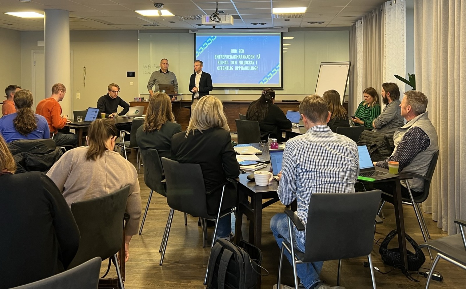 Under eftermiddagen följde en paneldiskussion med representanter från entreprenadföretag i regionen, där Rikard Gjärdman, affärsområdeschef bygg & anläggning från Foria, Fabian Wredhe, projektledare utvecklingsprojekt från ABT-bolagen och Robert Dahlberg, hållbarhetschef från M4-gruppen, diskuterade hur de arbetar med att möta de offensiva klimatkraven i offentlig upphandling. Mötet avslutades med ett gemensamt case-arbete där deltagarna fick arbeta med fiktiva entreprenadupphandlingar för att identifiera lösningar på de utmaningar som diskuterades under dagen.